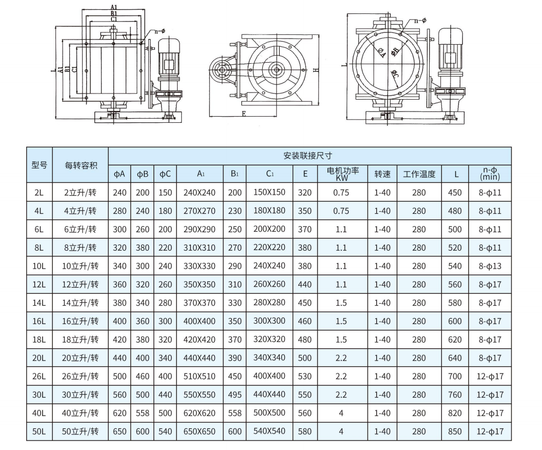 该型机组进出口安装尺寸一致,有圆形或方形进出口,上部进料,下部出料,减速电动机为侧置型,通过连接板与主机直接相连,链轮传动。适用于高温及其它一般工况。